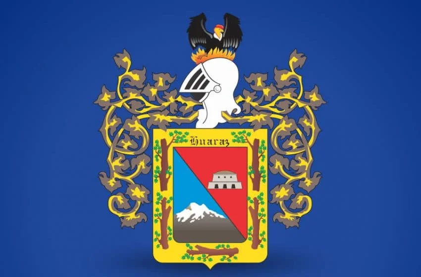 El Escudo está dibujado en un estilo conocido como español – francés, en su extremo bajo ligeramente redondeadas y unidas en el centro, formando punta. Esta partido en dos campos en diagonal. con una bordura en el interior, donde se ven troncos y brotes de una planta y el nombre de Huaraz.